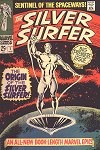 Silver Surfer was once an ordinary man called Norrin Radd, living peacefully on a planet called Zen-La. One day Galactus came to Zen-La and Norrin wanted to stop him from eating his planet. He made a deal with Galactus that if he became his hearld (servant) and helped him find planets to eat, Zen-La would be spared. Galactus agreed and turned Norrin Radd into the Silver Surfer. It was Norrin's intention to find uninhabited planets for Galactus to eat. But during his transformation, Galactus wiped out his memery clean. Silver Surfer had a vast amount of powers. First he was indestructable and extremely strong. He had the power cosmic that allowed him to do many things from simple force blasts to molecular reconstruction. He also had eyesight that could see things we could not, and could control his space-surf-board by thought. After helping the Fantastic Four defeat Galactus, Silver Surfer was "imprisoned" on Earth by Galactus. That is where the Silver Surfer series started (August 1968). He would later be freed from Earth and roam the stars. The Silver Surfer would also become a member of the superhero team called The Defenders.